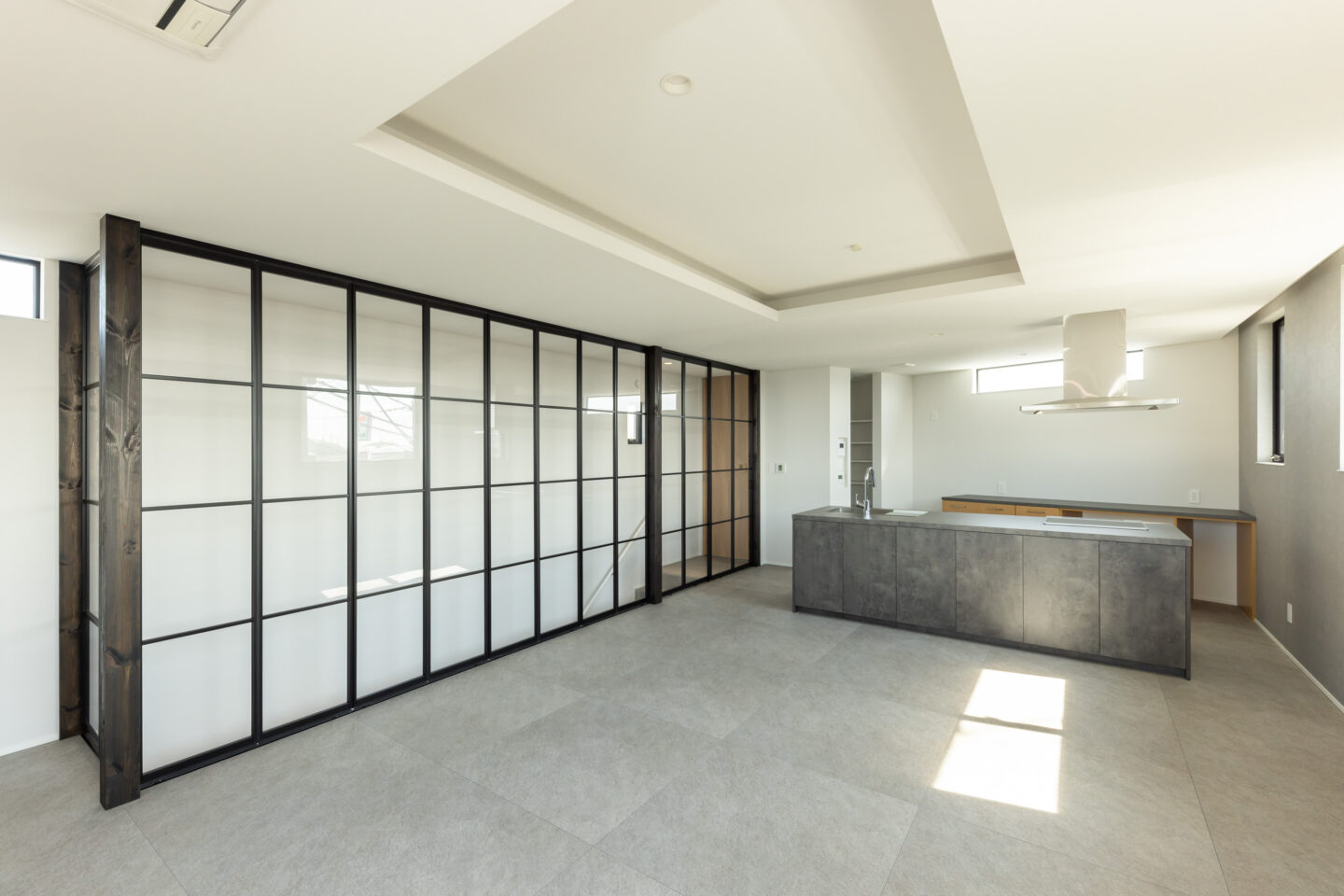 広々としたリビングダイニング、リビングから階段の壁をガラスで仕切ることで、光あふれる開放感な室内になっていることも特徴です。